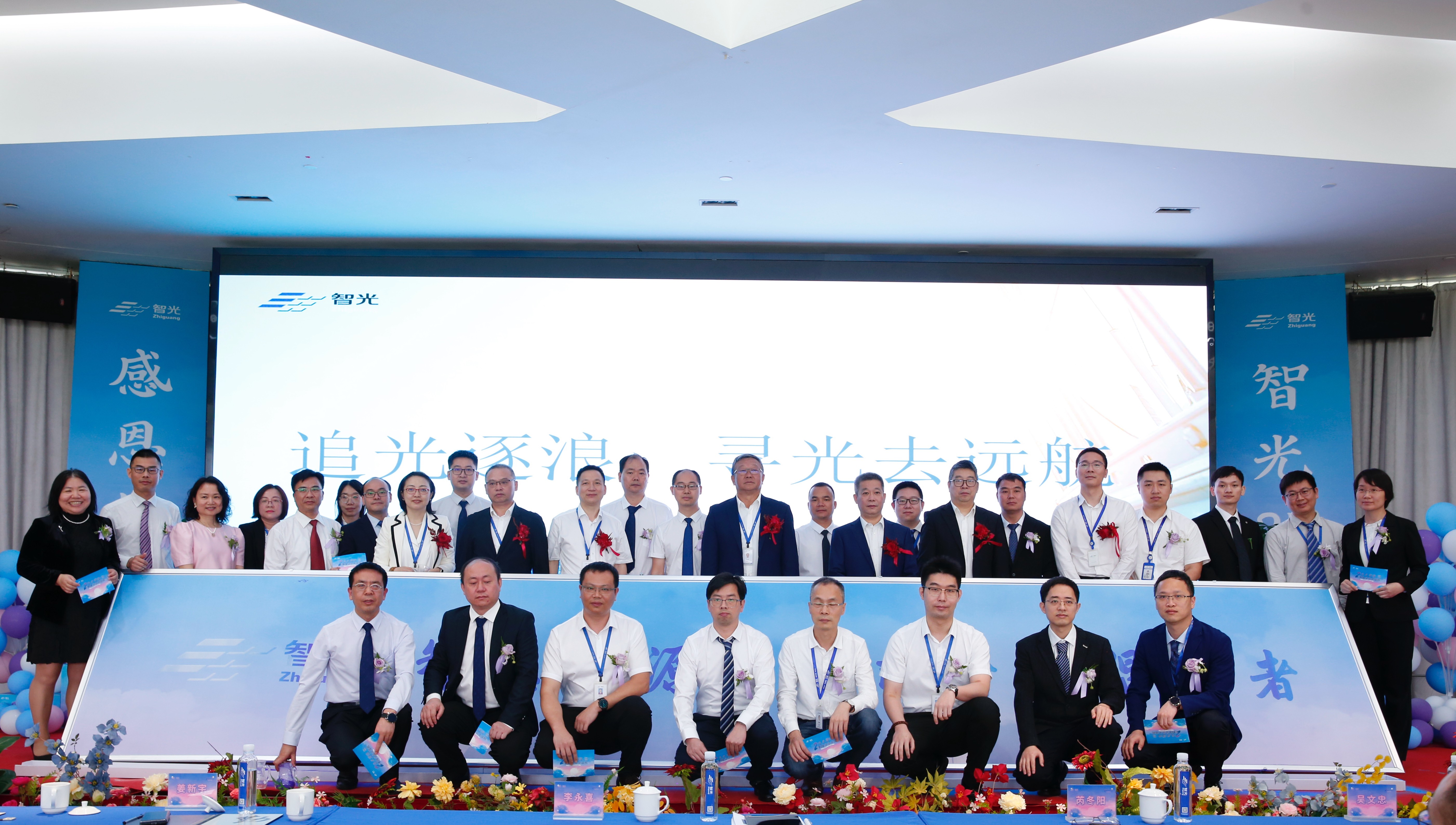 過去25年,智光人一直秉持“創新、責任、團結、堅持”的企業精神,凝心聚力、奮力拼搏。慶典上,4組員工代表分別分享了他們的追光故事,公司副董事長芮冬陽、常務副總裁姜新宇、副總裁吳文忠、副總裁曹承鋒向這4組員工代表贈送鮮花表達了敬意。